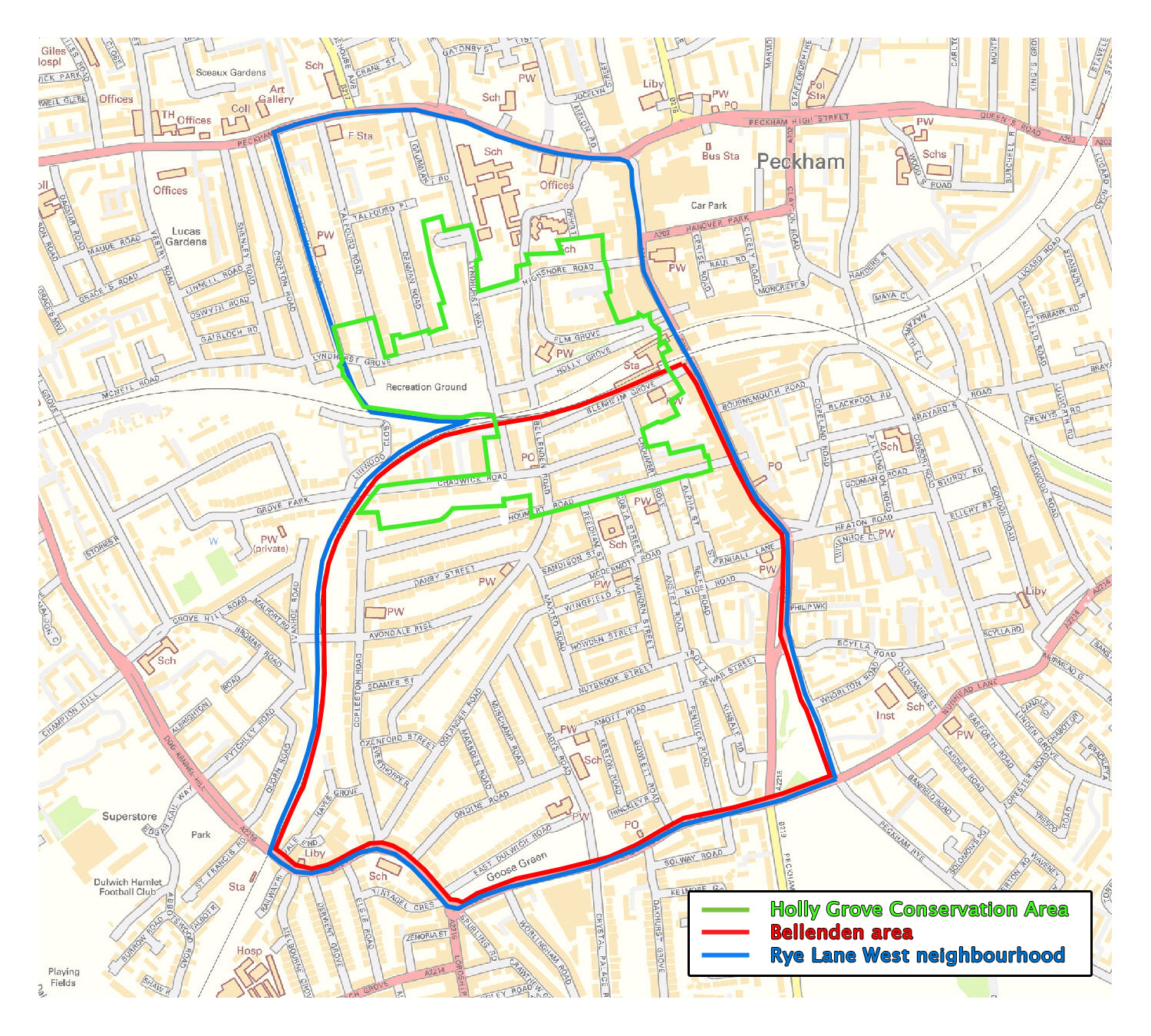 Rye Lane West is the area that adjoins the borders with Camberwell, and includes the Holly Grove Conservation Area and the Bellenden Renewal Area which overlap and cover together most of the area (see map). It is predominantly Victorian terraces, with newer developments filling in the war time bomb damage. It contains a wide variety of houses, architectural styles and streetscapes. In addition, with its emphasis on gardens, open space, local shops and in some parts lack of through traffic, it also has sufficient common features that make it feel like a well-defined enclave set between Peckham, Camberwell, East Dulwich and Peckham Rye. It is a residential neighbourhood squashed right up against the western edge of Peckham Town Centre which has a very different kind of character. Peckham Rye Station, right where the neighbourhood meets the town centre, is a major gateway to the neighbourhood, the town centre and the wider area. The neighbourhood is also on the path of the large volume of commuter traffic in the rush hours, sweeping into central London in the morning, and out again in the afternoon/evening, bypassing the town centre. Several streets are dominated by that traffic in the rush hours, while other streets are not affected at all.